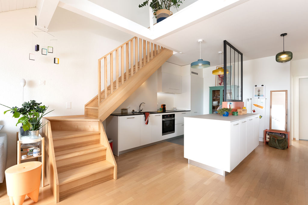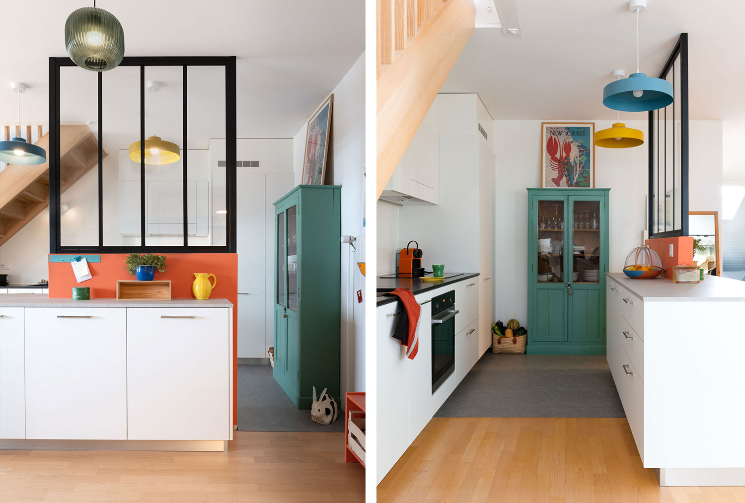 Par ici, on aime les couleurs par petites touches bienpensées. Une cuisine blanche permet de ne pas se lasser, tout en pouvant la customiser avec des accessoires colorés. On a en revanche craqué pour un mur coloré, qui est facile à repeindre si la couleur devait être changée.