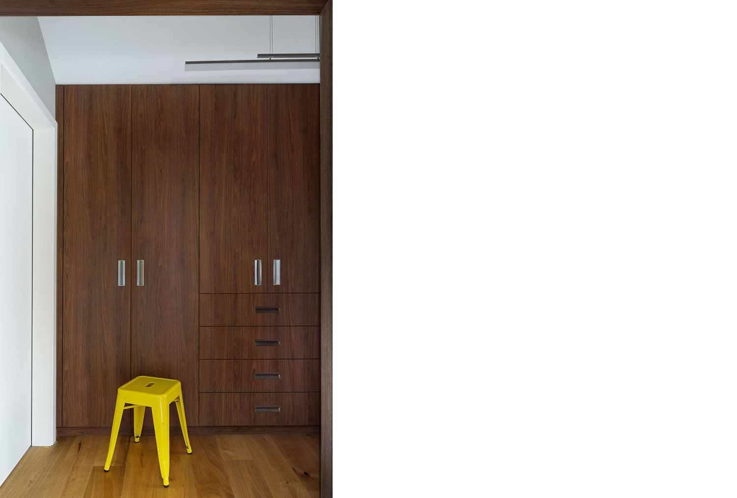 Un couloir avec un plafond en pente, une envie de rangementsoptimaux et cohérent.