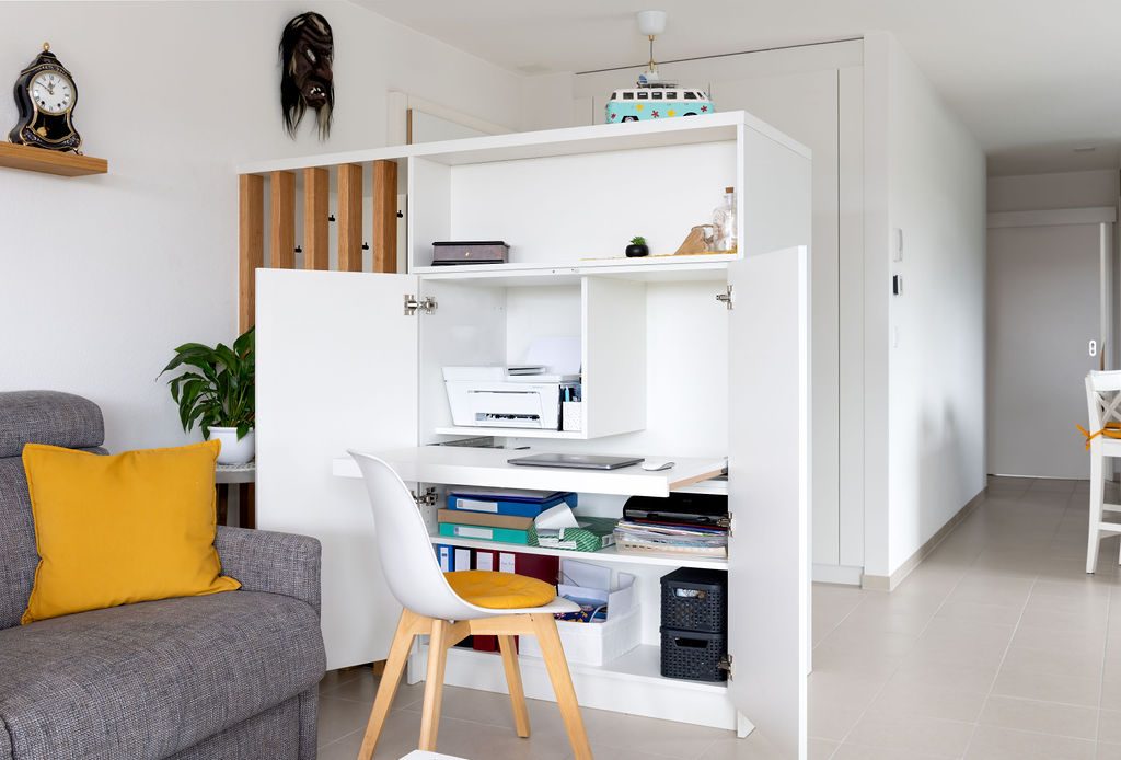 L’entrée qui arrive directement dans le salon n’était pas du goût des clients et il manquait une penderie. L’appartement ne permettant pas d'avoir une pièce dédiée au bureau, il fallait également un coin bureau. Il fallait qu’il soit discret car en plein salon. Une séparation entre l’entrée et le salon, qui fait également office de bureau, est née de cette réflexion.