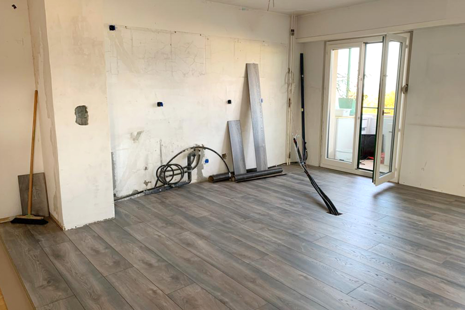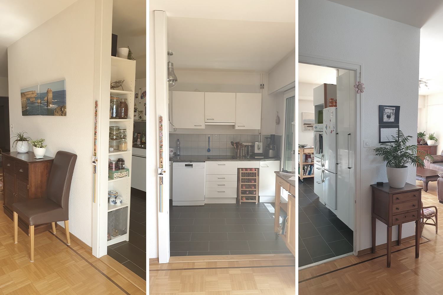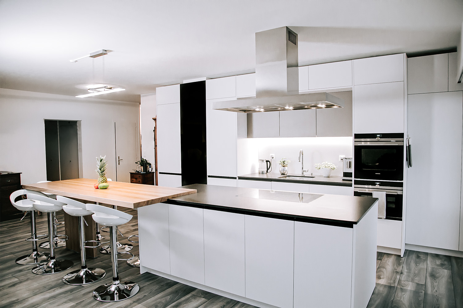 Les clients ne voulaient plus d’une cuisine semi-fermée, étriquée. Ils voulaient un îlot, du partage, de la convivialité. Les murs ont été abattus pour ouvrir la cuisine sur la salle-à-manger et le salon. Nous avons utilisé toute la hauteur, et pour cacher la gaine, on a utilisé un panneau en verre, qui permet l’écriture au stylo craie, mais aussi d’aimanterles souvenirs. La cuisine est en modèle JOY de la gamme EVERYONE de SNAIDERO, un plan de travail SILESTONE Marengo et des appareils Siemens. L’appartement était au 8e étage, il a fallu utiliser une grue pour livrer le plan de travail. Nous sommes aussi là pour régler ce genre de particularité.