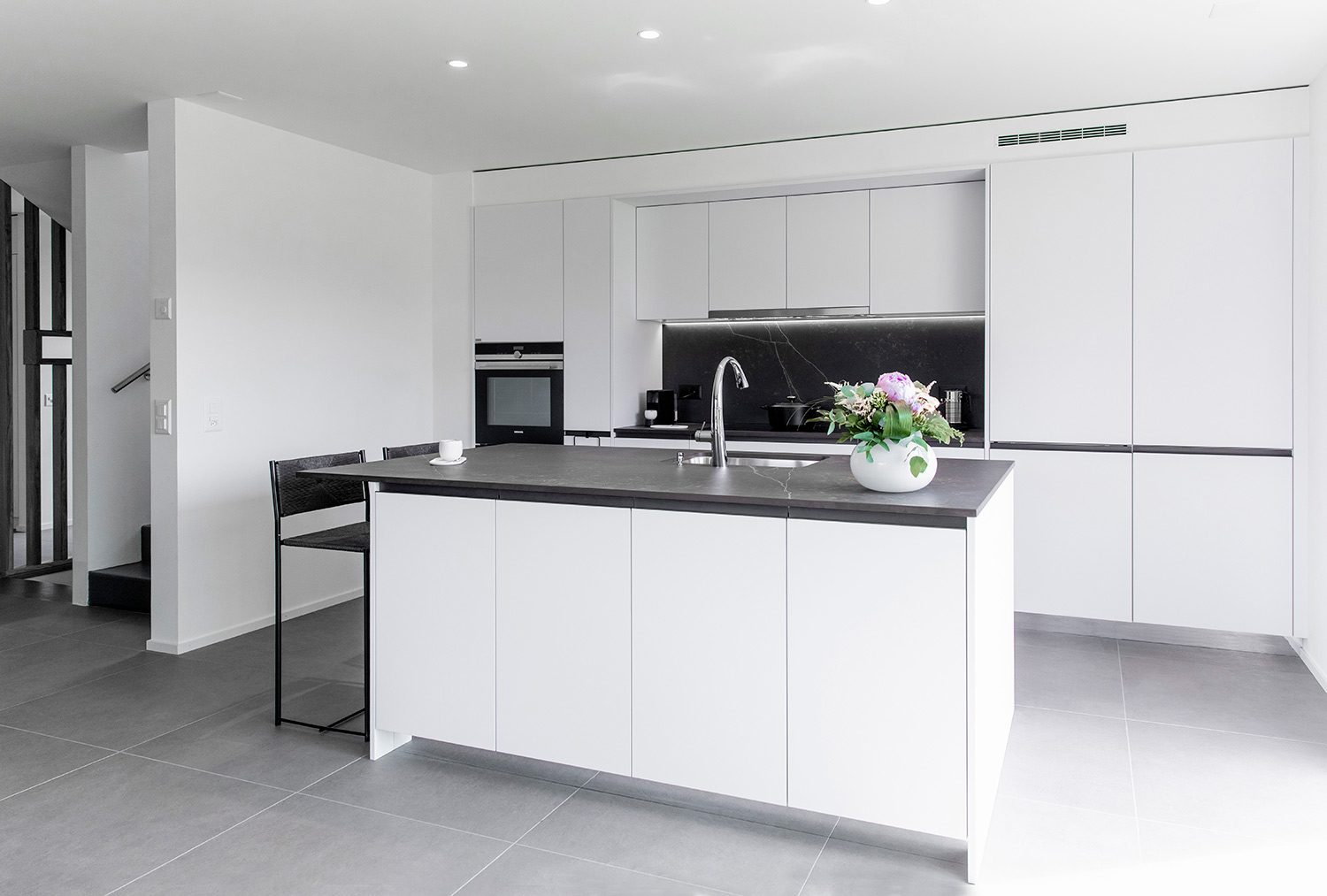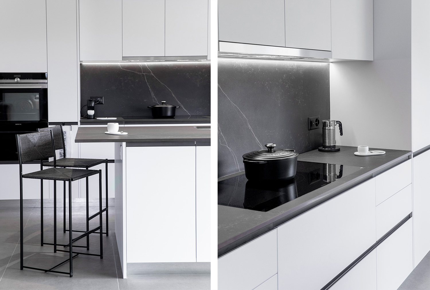 Dans une construction neuve, les clients souhaitaient une cuisine qui soit blanche. C’était le critère de base. Puis on a présenté les échantillons, cherché les associations, mis les différentes solutions à la lumière de la pièce. Et les clients ont choisis de partir sur une gorge presque noire, et un plan travail très foncé. La cuisine est une JOY de la gamme EVERYONE de SNAIDERO, les appareils du Siemens et le plan de travail du DEKTON Kelya Natural.