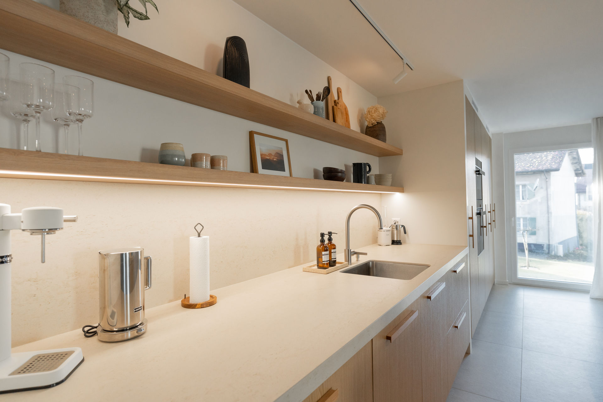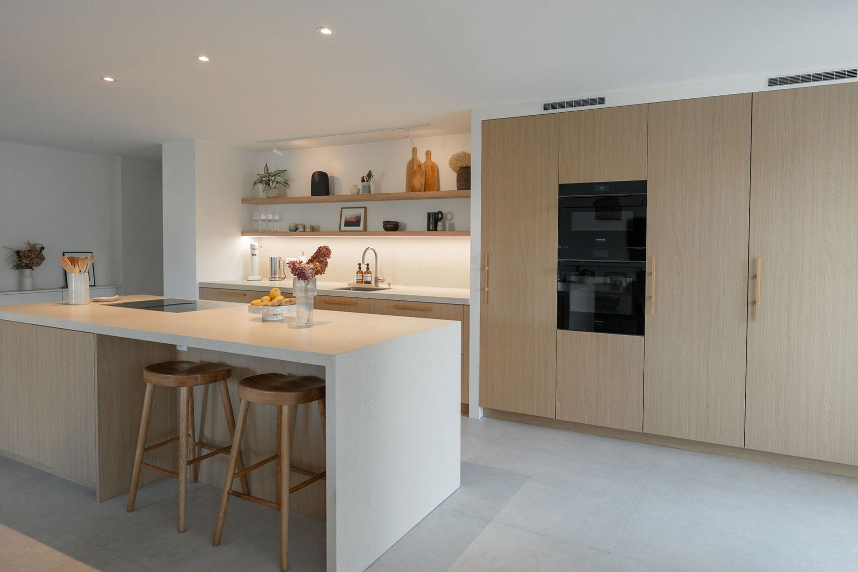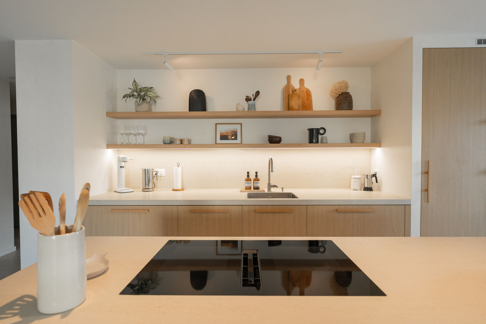 Cuisine pensée en cohérence avec toute la déco des clientsqui aiment les matériaux naturels, apaisants, doux visuellement.