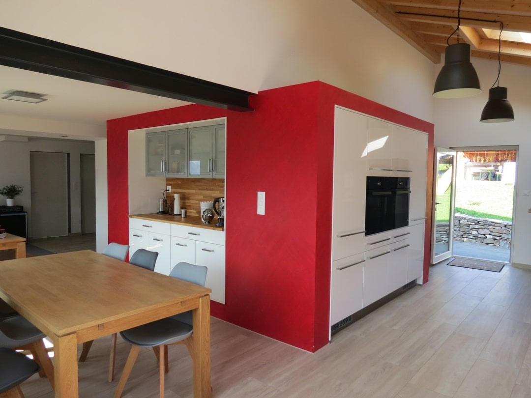 Les propriétaires ont fait une extension dans laquelle ils ont choisi d’y faire installer une cuisine. En discutant par rapport à leur plan, nous avons proposé d’accentuer l’effet cube central avec circulation tout autour. La cliente souhaitait une cuisine rouge et pour rappeler ce rouge, le cube en a pris la couleur. La cuisine est laqué brillant et le plan de travail est en inox, ainsi qu’en bois lamellé. Le choix des appareils s’est porté sur la marque V-Zug.