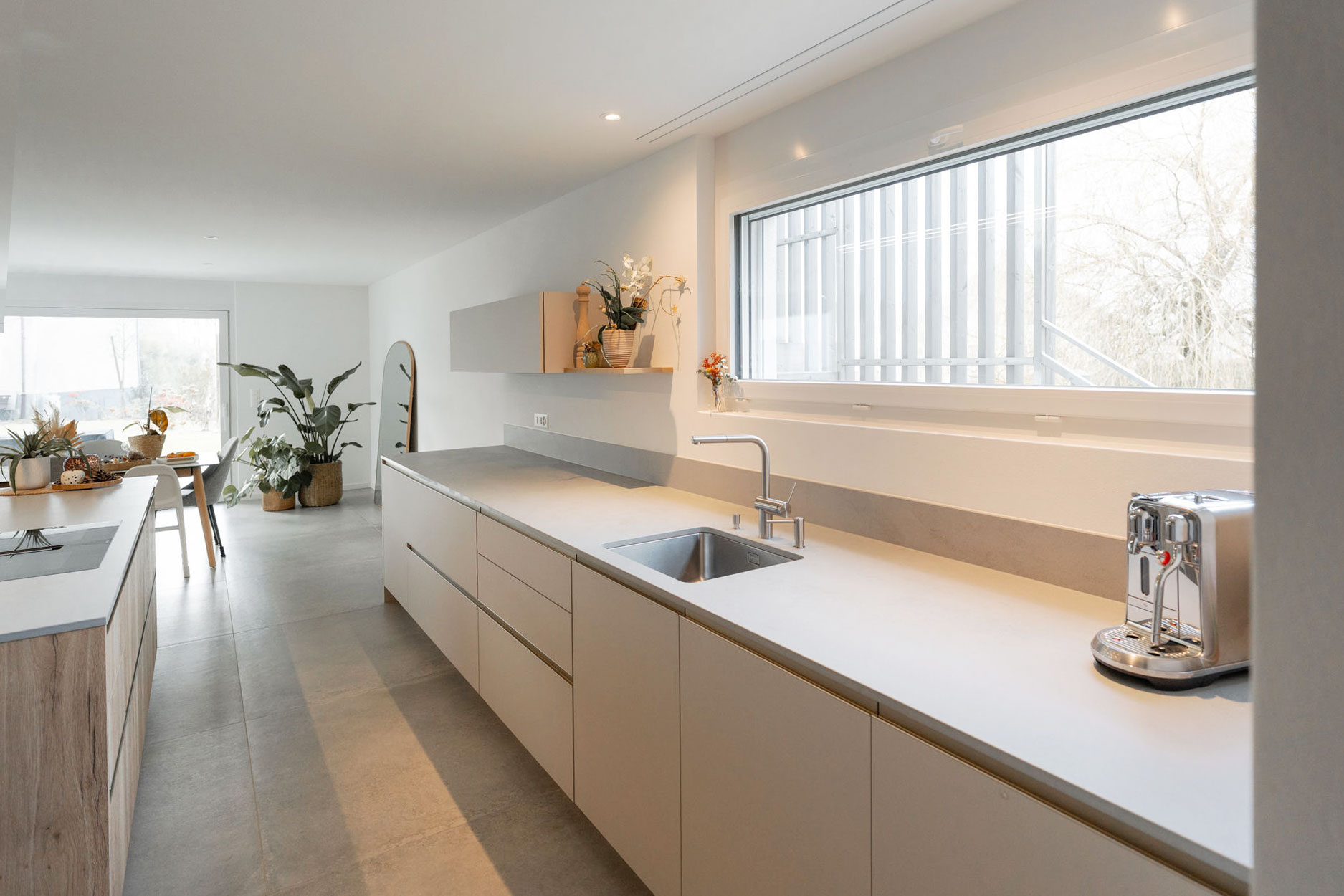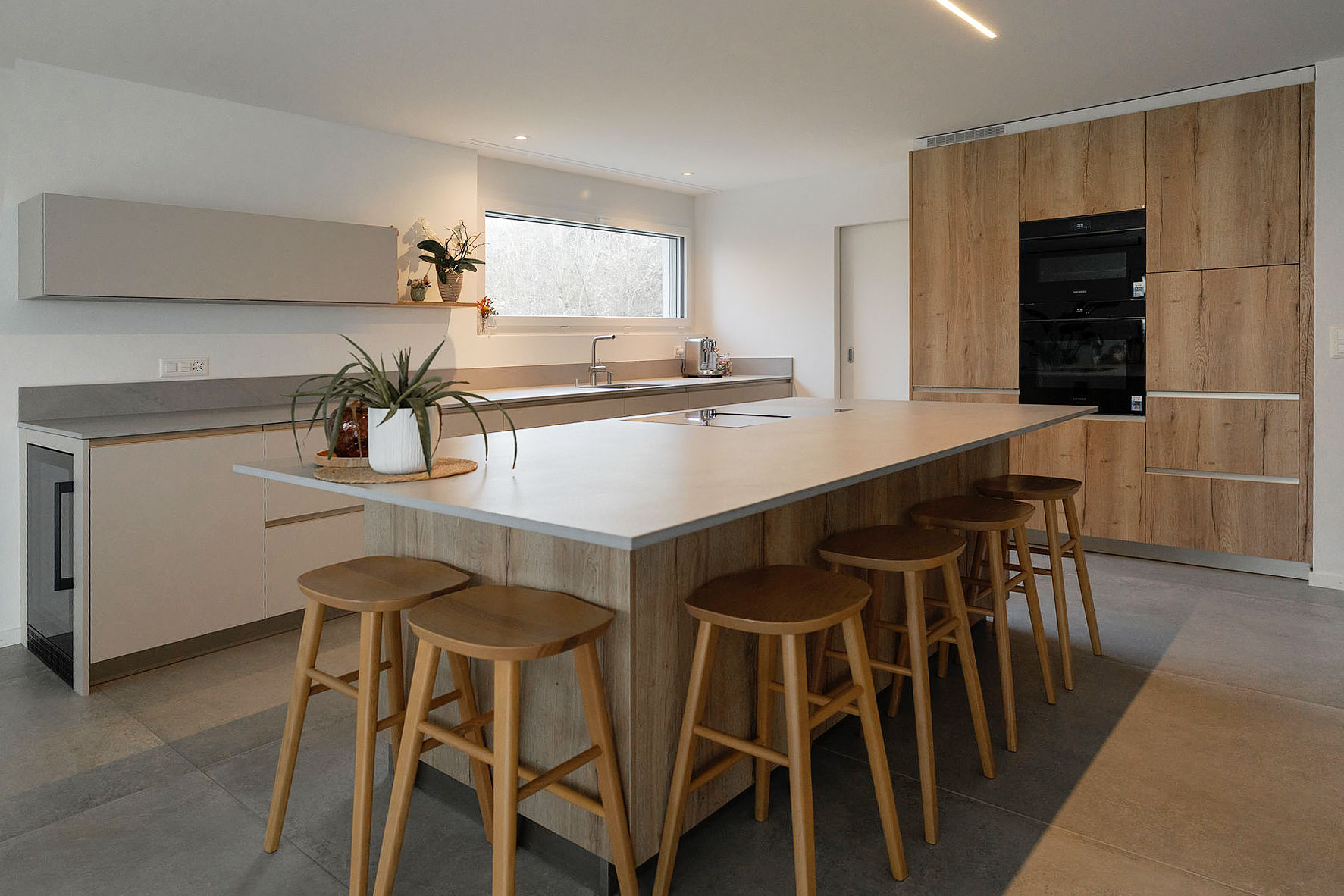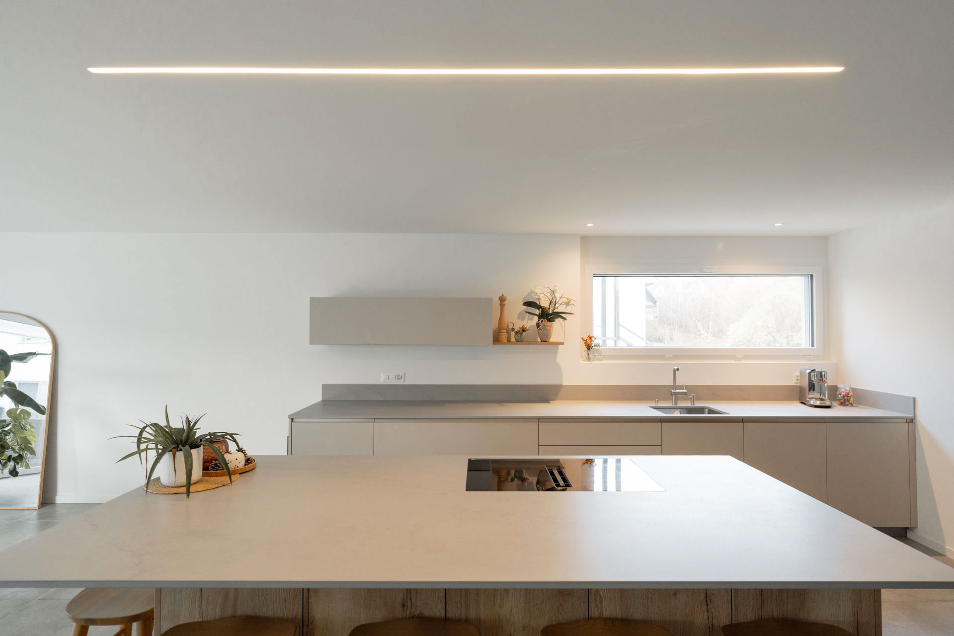Longue cuisine centrale dans une très grande pièce de vie.